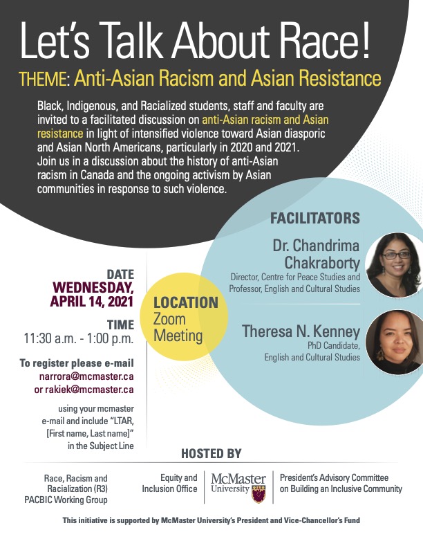 In April 2021, I was invited by the Race, Racialization and Racism Working Group (R3) of McMaster University’s PACBIC to speak along with Dr. Chandrima Chakraborty on Anti-Asian Racism and Asian Resistance in light of the 2021 violence in Atlanta, Georgia.
